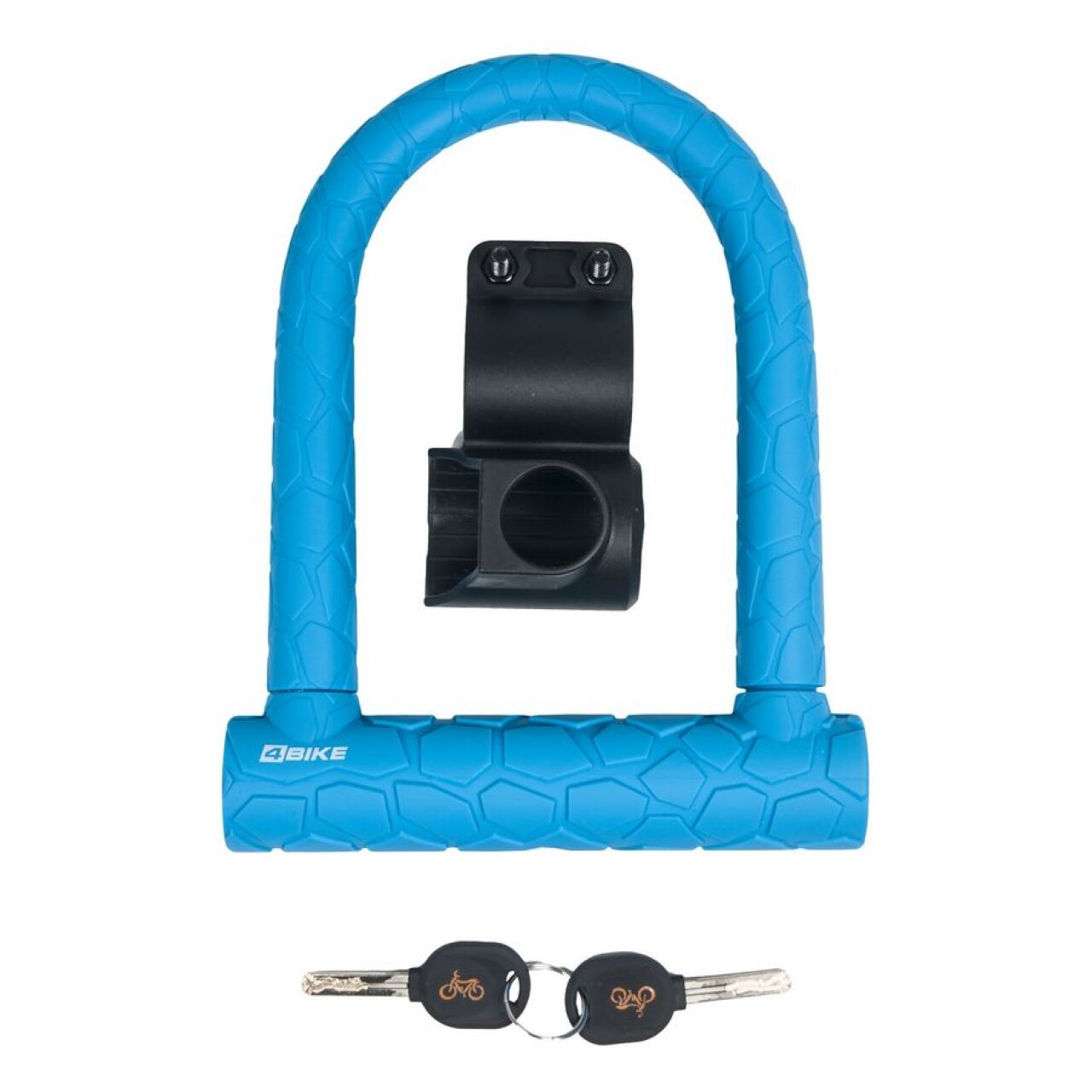 Велозамок 4Bike 610 –  недорогой и конструктивно надежный элемент защиты вашего велосипеда на парковке. Имеет простой и понятный запорный механизм типа Multi Lock под ключ, которых в комплекте поступает 2 штуки. Замок относится к типу U-lock, выполнен из стального, каленого прута толщиной 20 мм. Скоба имеет небольшие габариты 150 х 98 мм и мягкое силиконовое покрытие для защиты ЛКП рамы. В комплекте поставляется крепление для аксессуара на раму велосипеда. Поставляется в черном или голубом цвете.
